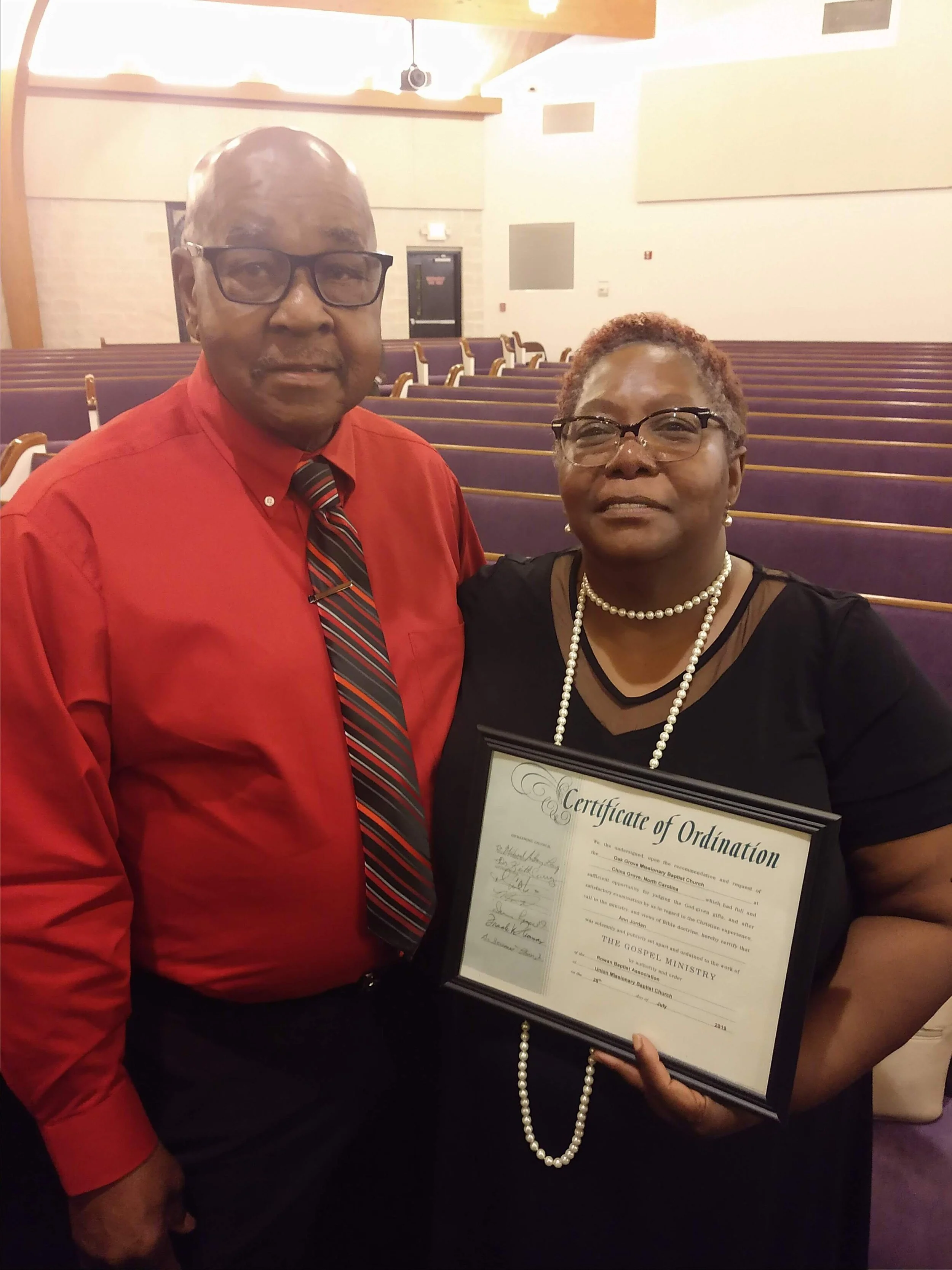 We celebrate Reverend Ann Jordan who was ordained by the Rowan Baptist Association at the annual session. Cecil Jordan, her husband, is pictured here as well.