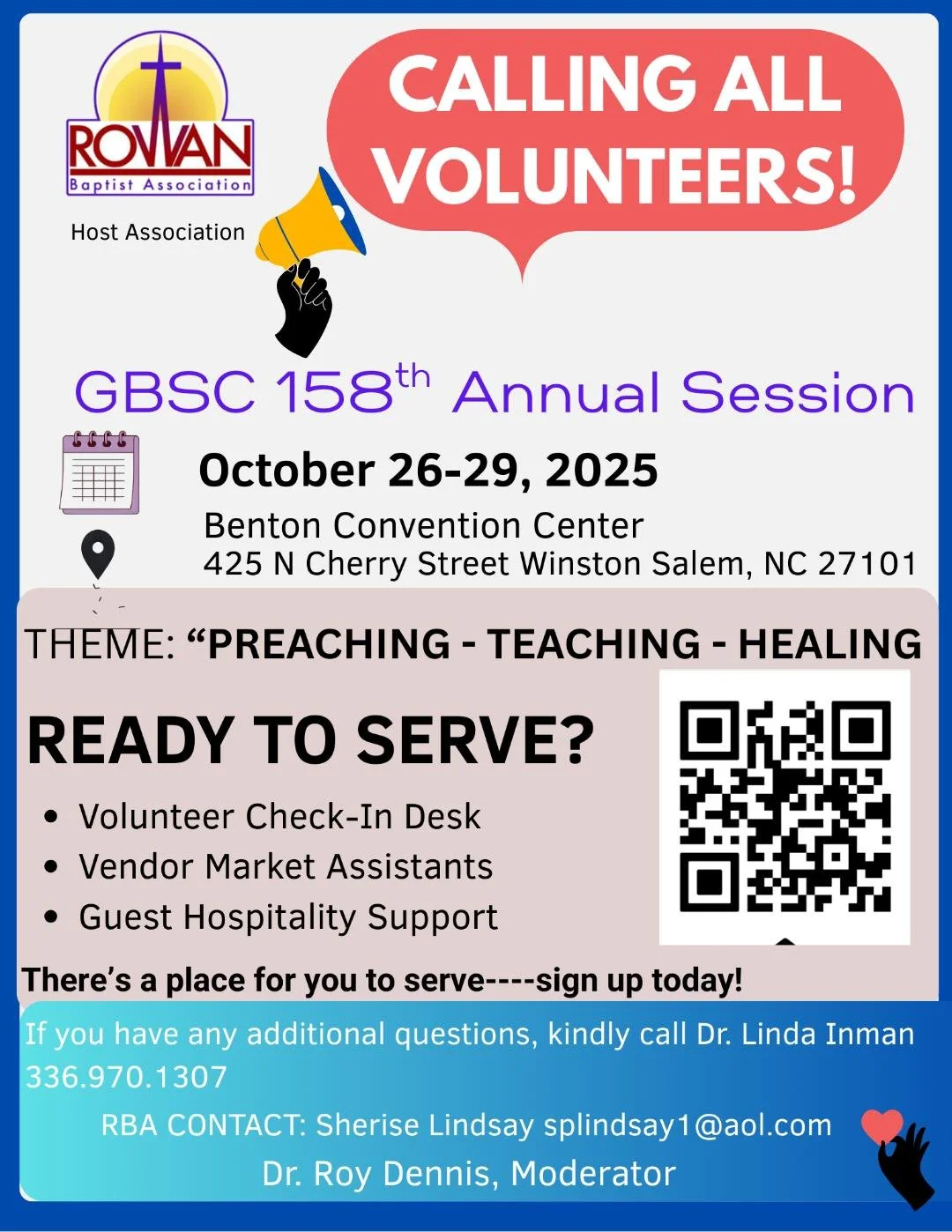 Volunteers Needed 158th General Baptist State Convention Oct 26-29 in Winston Salem NC Host Church is Emmanual Baptist Church Rev Dr. Herbert Miller II. Please click this link to see details